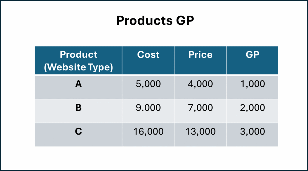 He learned that Zelig sold 3 types of products (sales websites) with different prices, costs, and profits.